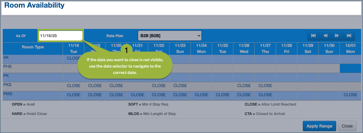 1. The Availability screen displays 14 days starting from today. If the date you want to close is not visible, use the date selector to navigate to the correct date.