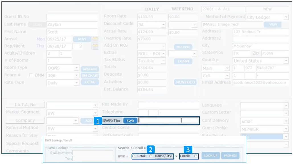 To be able to enroll a new Guest into the BWR program, the guest has to be in a saved reservation either on a status HLD (Hold), GTD (Guaranteed), or IN (Checked-In). If you are creating the reservation, you will first need to save or check it in and then go back into it. Make sure all the mandatory fields are completed: Last name, First name, Address 1, City, State, Zip Code, Telephone, and Email.