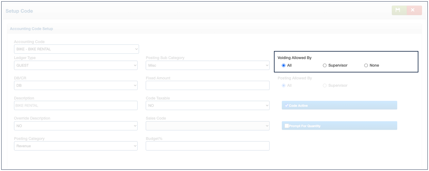 There are various choices for configuring void authorization on a code. You can decide whether to permit the code to be voided after posting, allow anyone to void it, or restrict voiding to users with supervisor credentials.