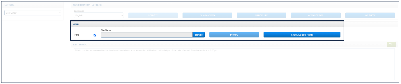 1. Check the Html box and click on "Show Available Fields" to see what fields can be added to the Html letter.