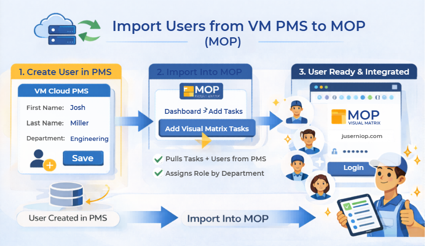 When your property is integrated with Visual Matrix PMS (VM Cloud), new users created in the PMS can be automatically imported into MOP during the task import process.