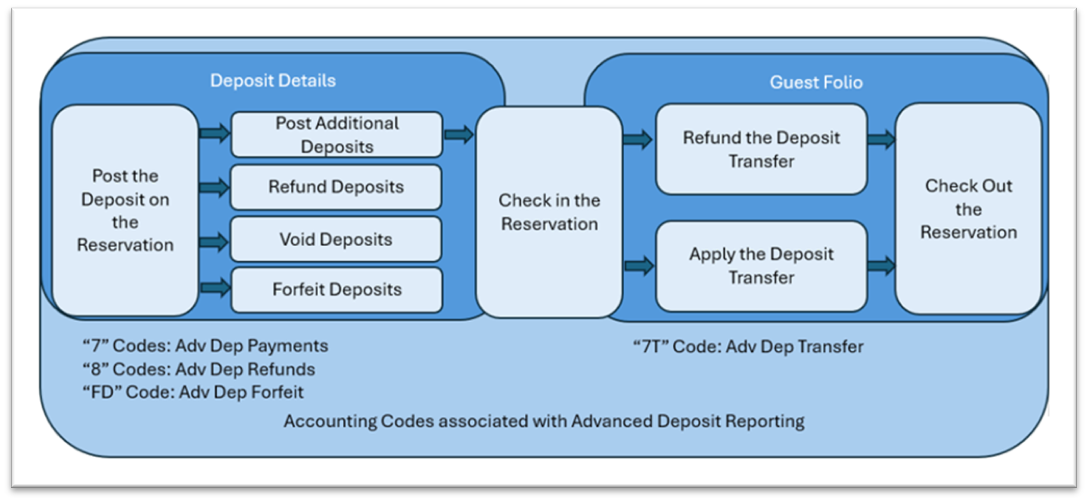Outcome: The guest’s reservation is now secured with an advance deposit, and the payment is reflected in the guest's Advanced Deposit Details and will be transferred to the guest's folio as a prepayment once the reservation is checked into the system.