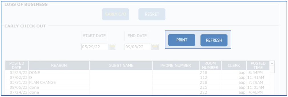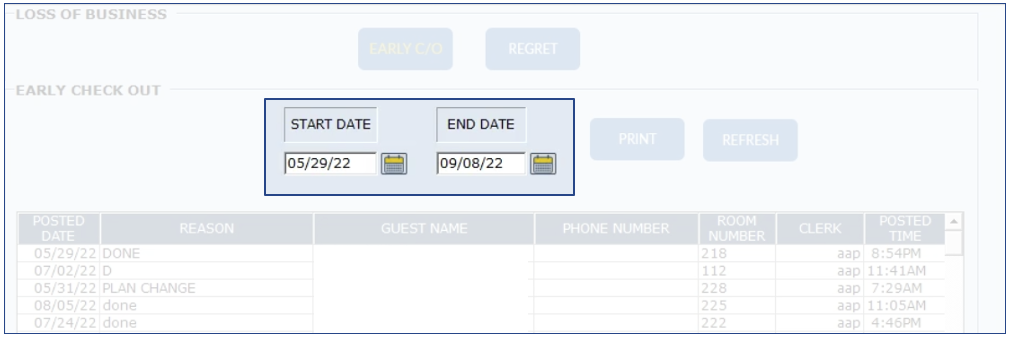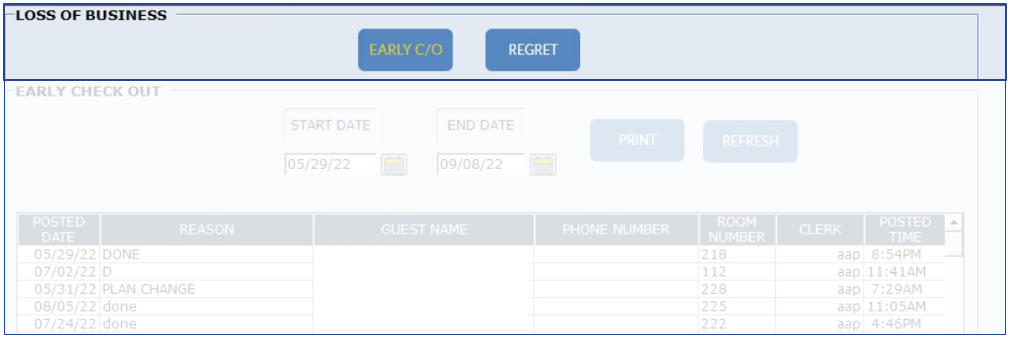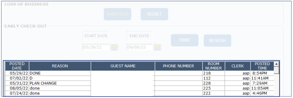 Check Outs Loss of Business allows you to view any guests who have checked out early.