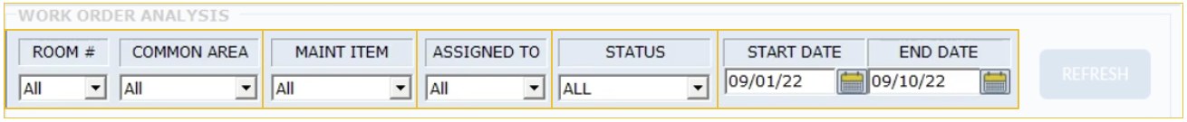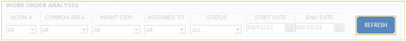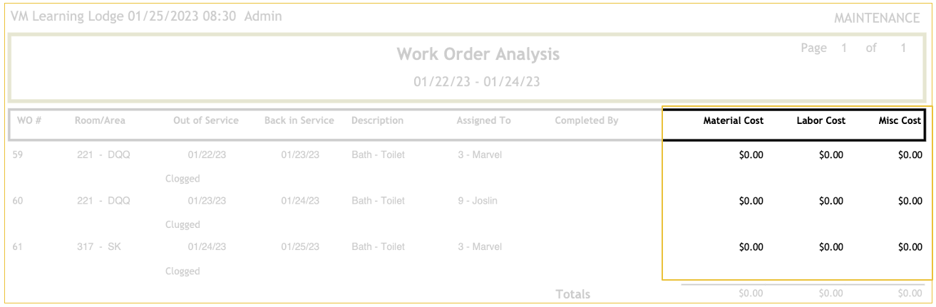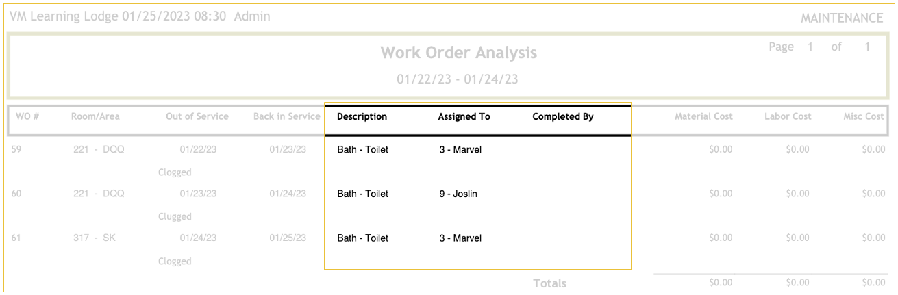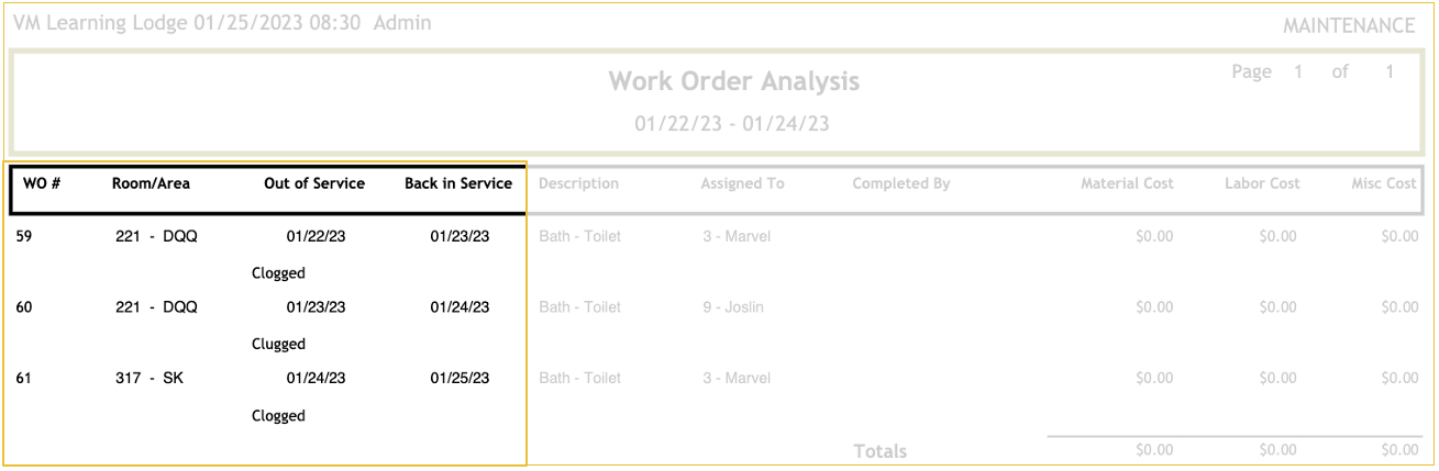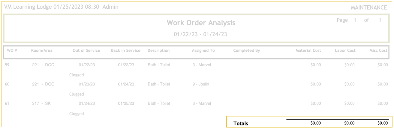 The Work Order Analysis report allows you to view every work order for a specific time frame, the details of who opened and closed it, its out-of-order status, and any costs associated with the work order.