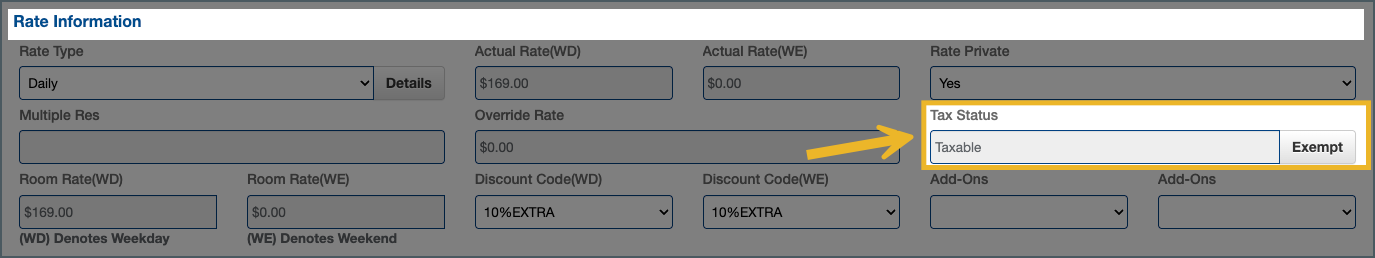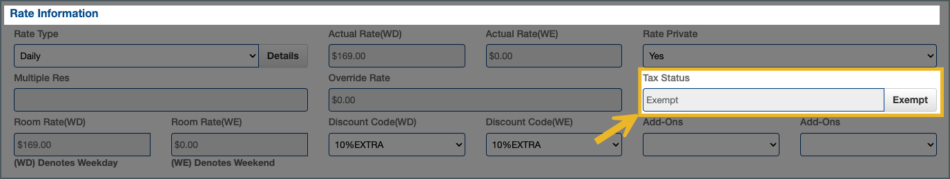 1. Locate the Tax Status Field: Open the reservation, then scroll down to the Rate Information section.