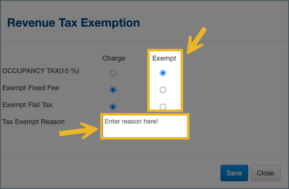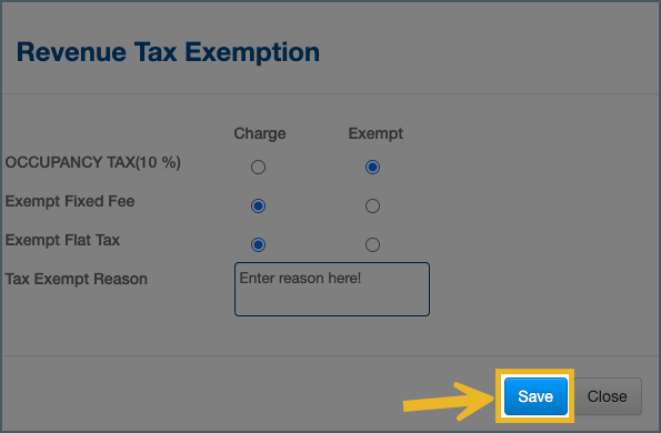 Tax exemption applies only to room revenue charges. Other taxable items—such as incidentals or add-ons that are not categorized as room revenue—will still post with tax unless they are manually adjusted.