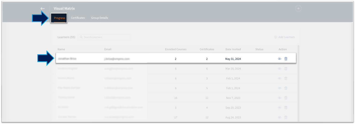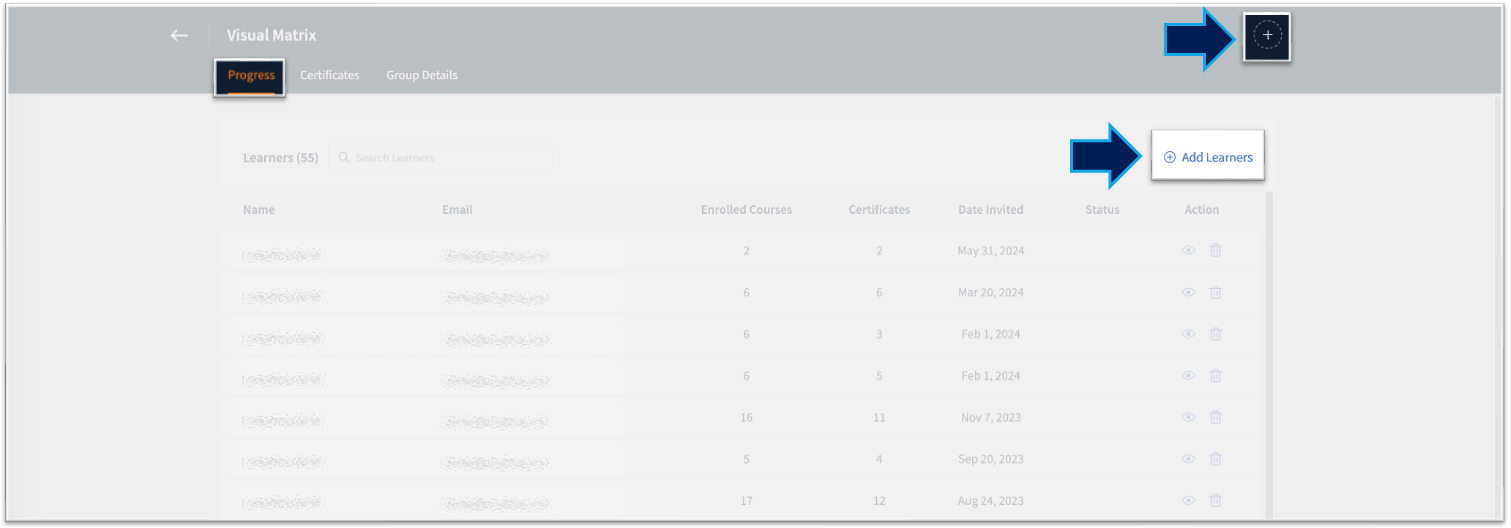 6. From the "Progress" tab, click on "Add Learners" or the "+" icon at the top right.