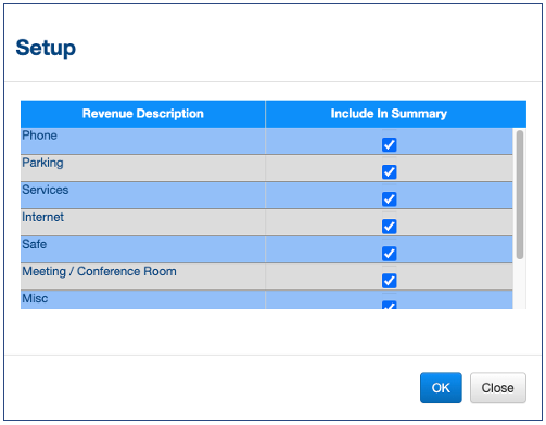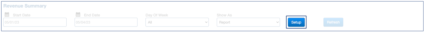 Path: Management > Reports > History > Revenue Summary > Click on Setup