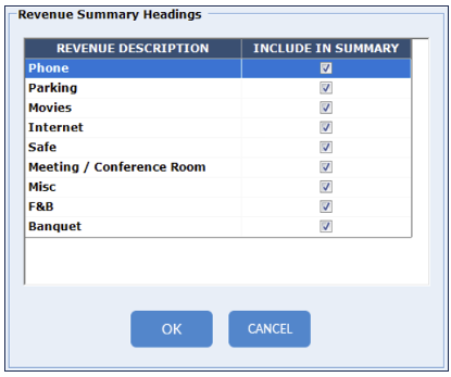 Click on any line, modify to fit your needs and click ok when done. Uncheck any Revenue you do not need to see in the report. The new categories will now reflect in the Revenue Summary Report and in the Accounting Code setup.