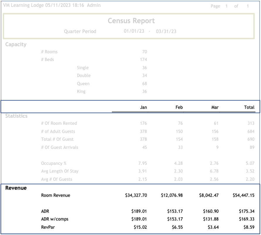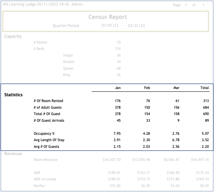 The Census report is a quaterly report of the property capacity, statistics and revenue by month.