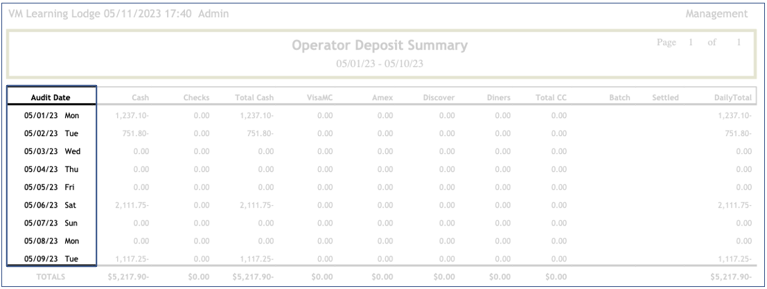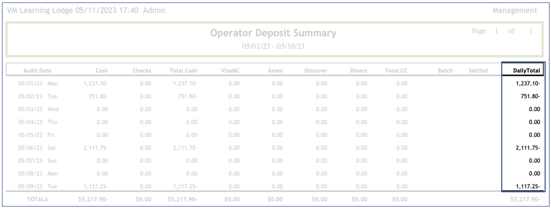 The Operator Deposit Summary History report displays the total by method of payment by day.