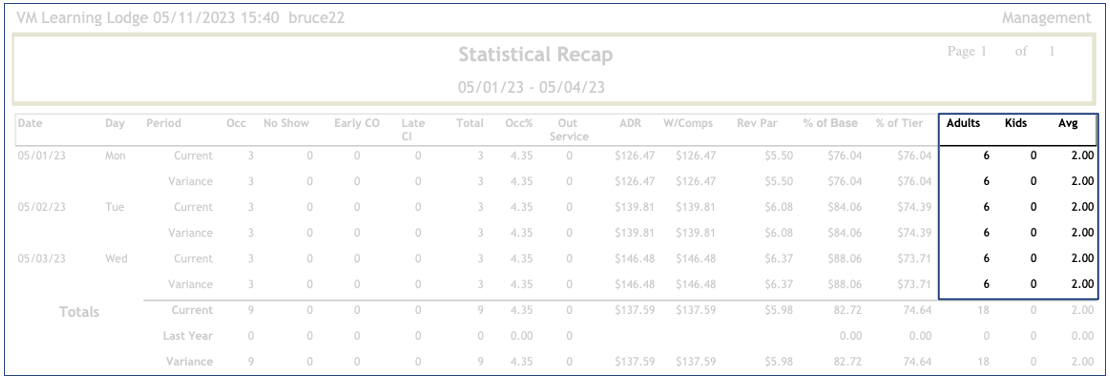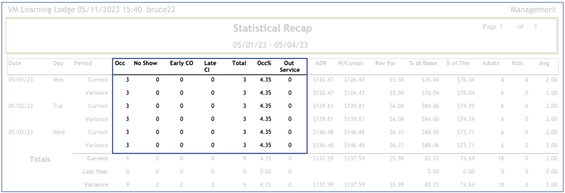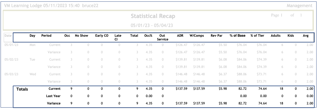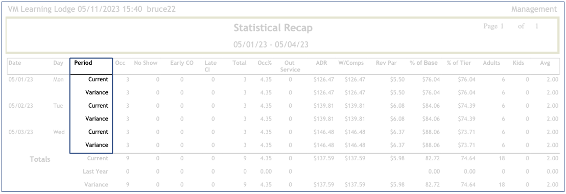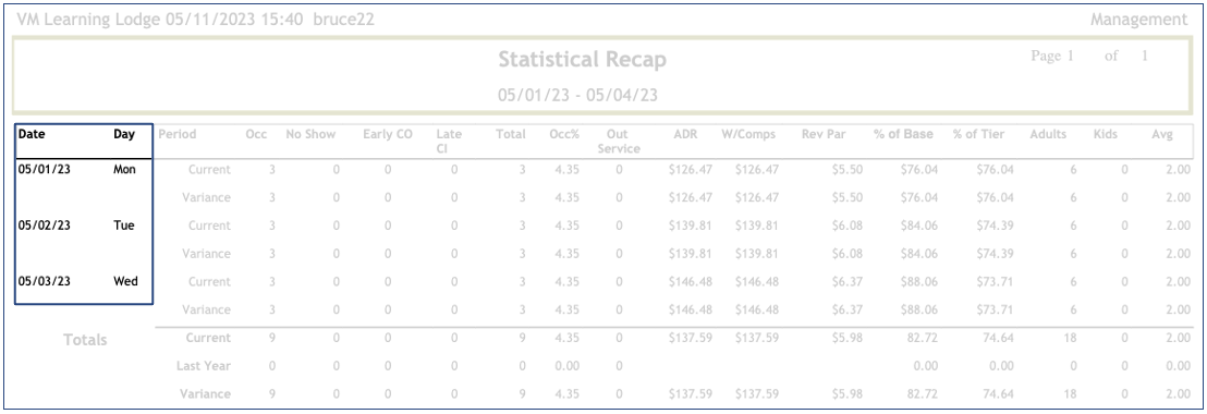 - Each day will display stats for the current year, previous year (if checked) and the variance.