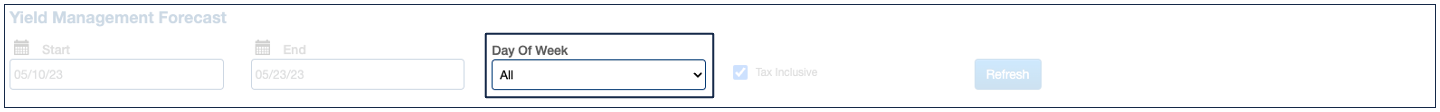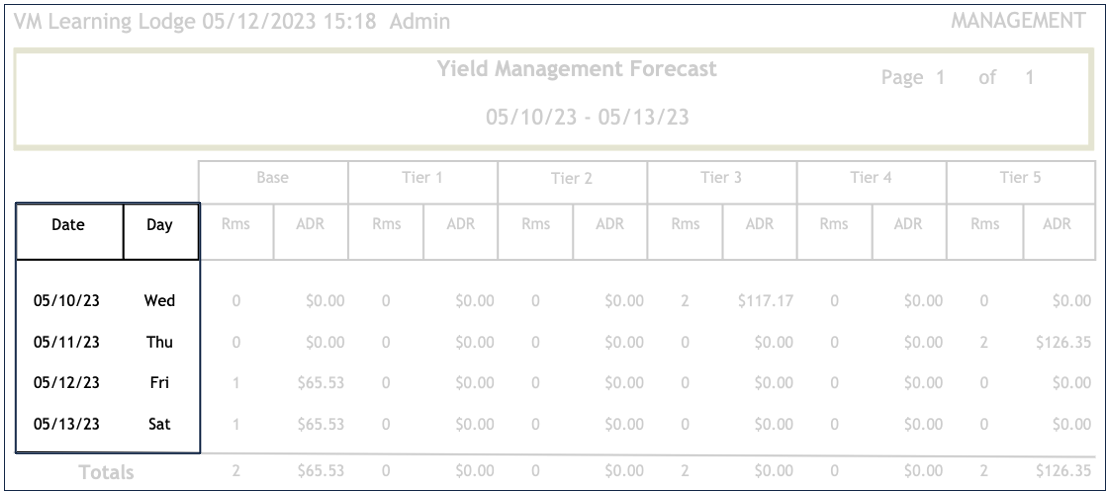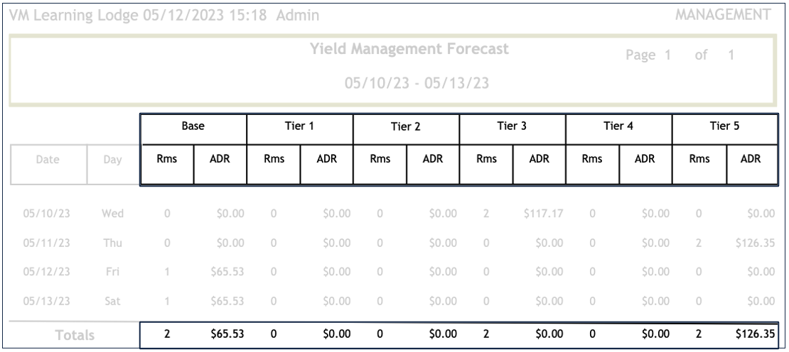 The Yield Management forecast report will display the daily number of rooms currently booked in the system by tier (base to tier 5) and the ADR for that tier that day.