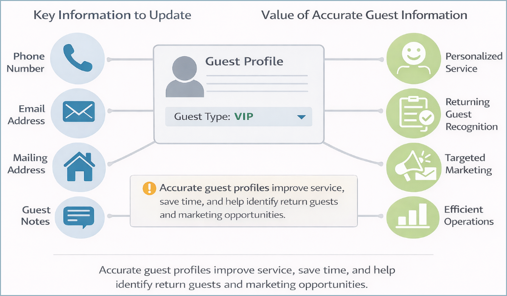 Taking a moment to review and update guest profiles during daily operations helps maintain accurate records, streamline reservations, and support a better overall guest experience.