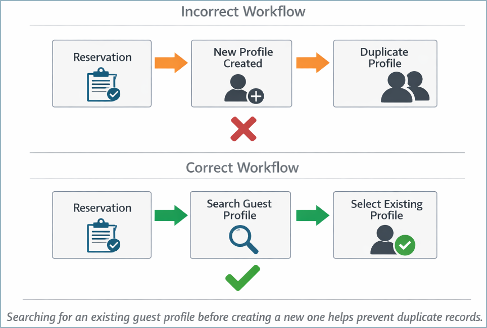 Creating a new profile without searching first is the most common cause of duplicate guest profiles. Duplicate records can lead to inconsistent guest information and may require merging profiles later using the History Merge tool.