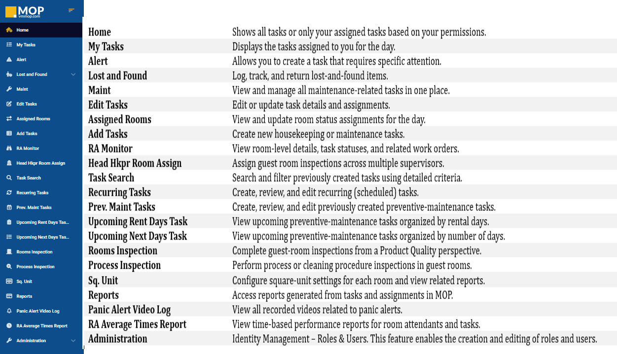 The MOP 2.0 Dashboard is your control centre for tasks, room status, and operational workflows. From the left‐hand menu, you can access your tasks, team tasks, reports, and real-time updates — all based on your role’s privileges. Below you’ll find key sections of the dashboard.