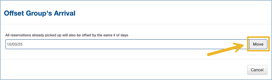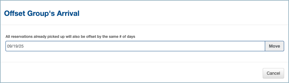 After clicking Move, all picked-up reservations in the group will be updated to the new dates in a synchronized batch. The system adjusts inventory and origin/destination scheduling accordingly.