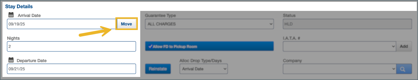 When a group must shift their entire stay to new dates (not merely extend or trim existing dates), use the Move button so that all picked-up reservations in the group are rescheduled together. This method helps maintain inventory integrity and ensures consistency, especially when using a Channel Manager. Choosing to manually change dates separately risks misalignment in availability, reservation overlaps, or channel sync errors.