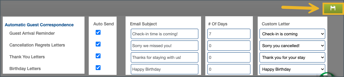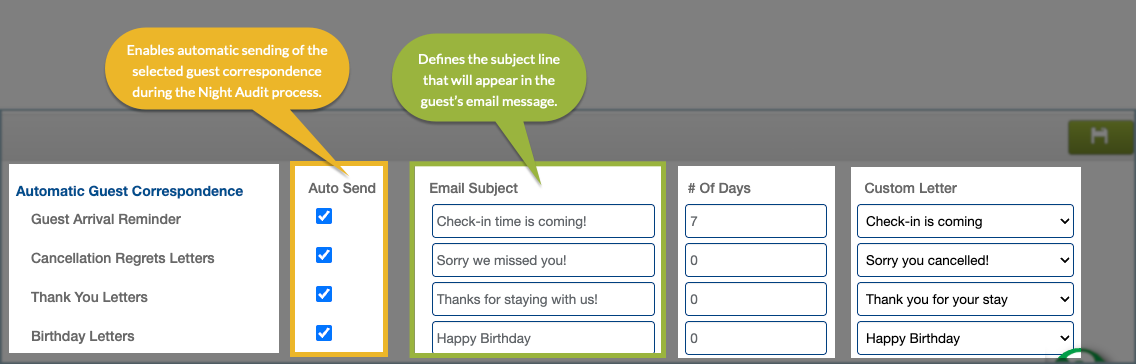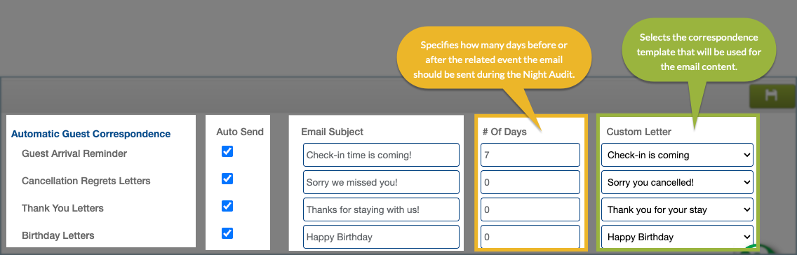 - When enabled, the system will automatically send the email during the Night Audit when the corresponding event occurs.