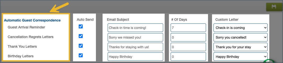 The Automatic Guest Correspondence settings allow the system to send predefined email messages to guests automatically based on specific events. These automated emails can be used to communicate with guests at key moments of their stay, such as before arrival, after checkout, or when a reservation is cancelled. Each message uses a custom letter template that must first be created in the Management section. Once configured, the selected correspondence will be sent automatically when the corresponding event occurs.