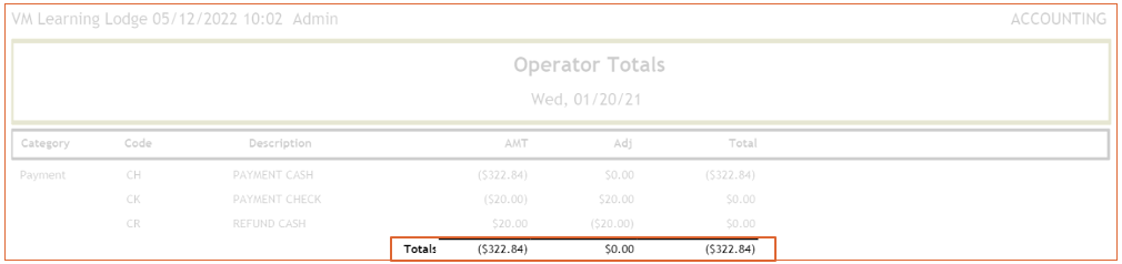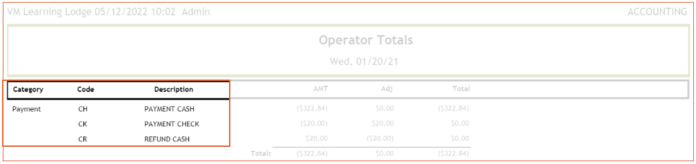 - Type of accounting code. As this is the Operator Transactons, only the Payment types will show.