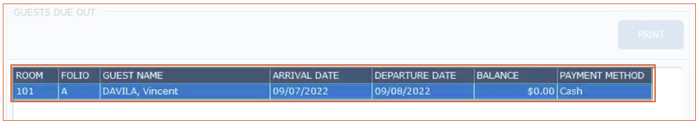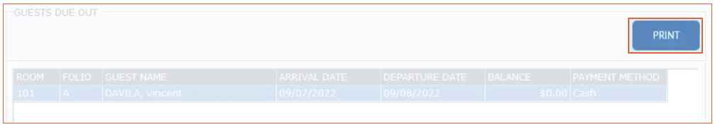 The Guest Due Out report shows any rooms that have their departure date on the current day and has not been checked out.