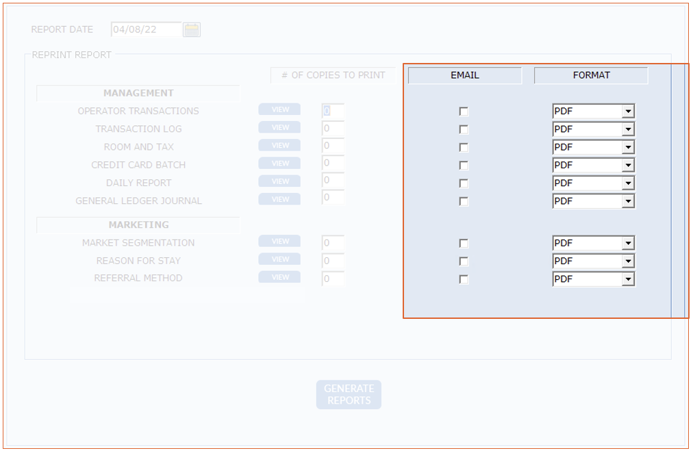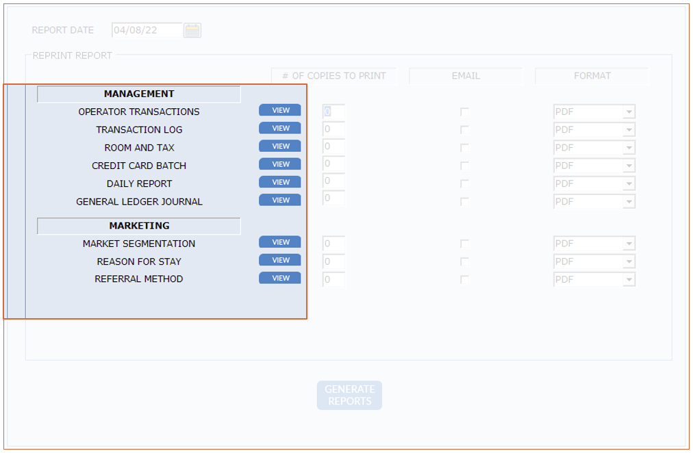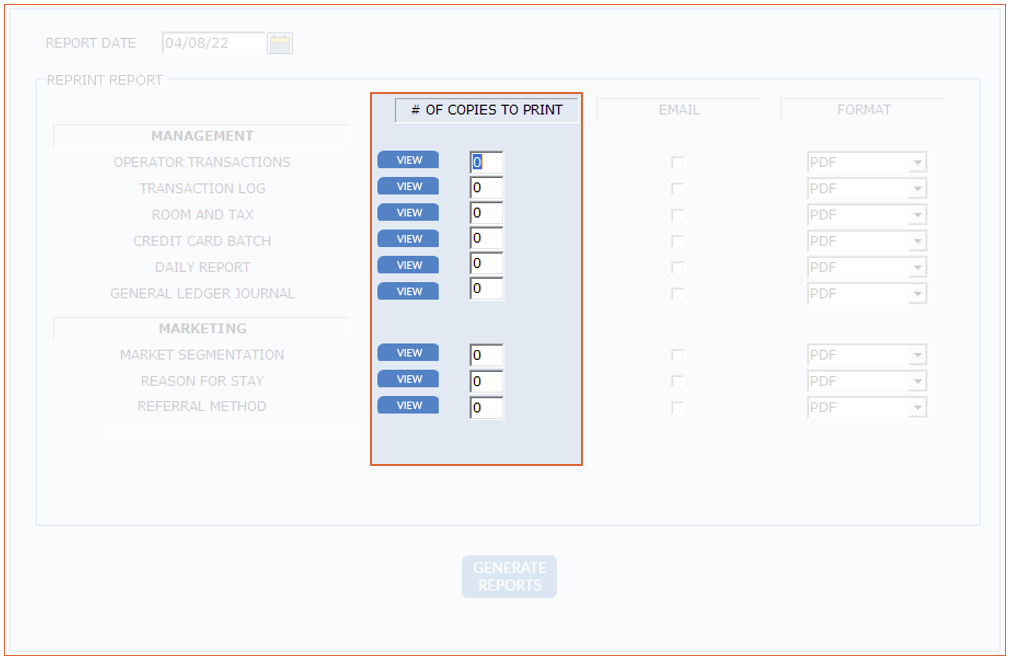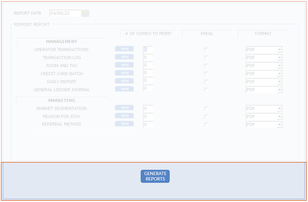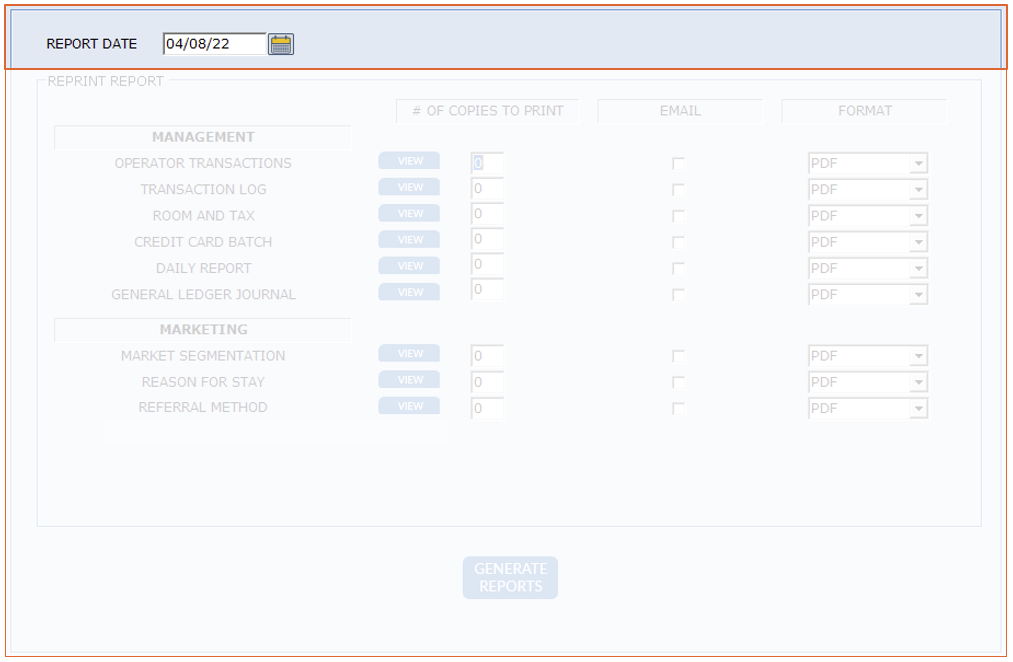 Daily Report: will give a statistical recap, a detail listing per guest ledger, a detail listing per city ledger, a detail listing summary per guest ledger and city ledger.