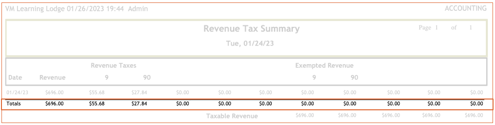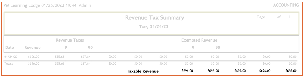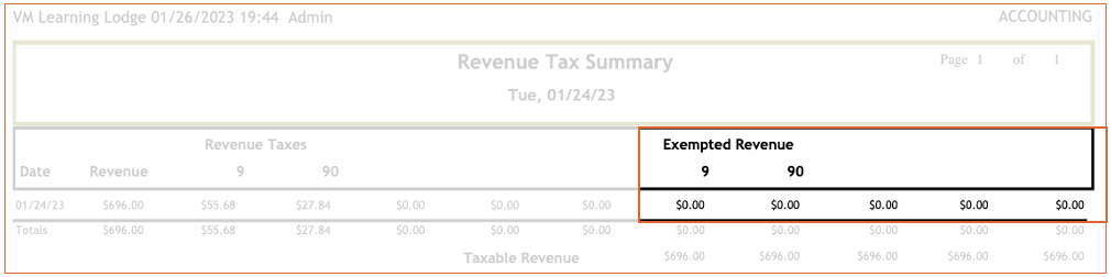 The Revenue Tax Summary report shows the total Revenue for one or multiple days (taxable and exempted) and the total taxes as well as the total exempted revenue.
