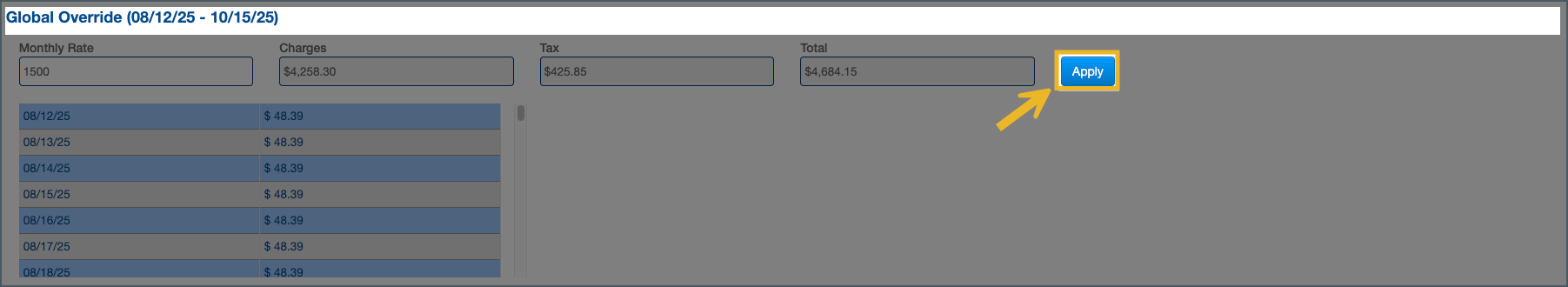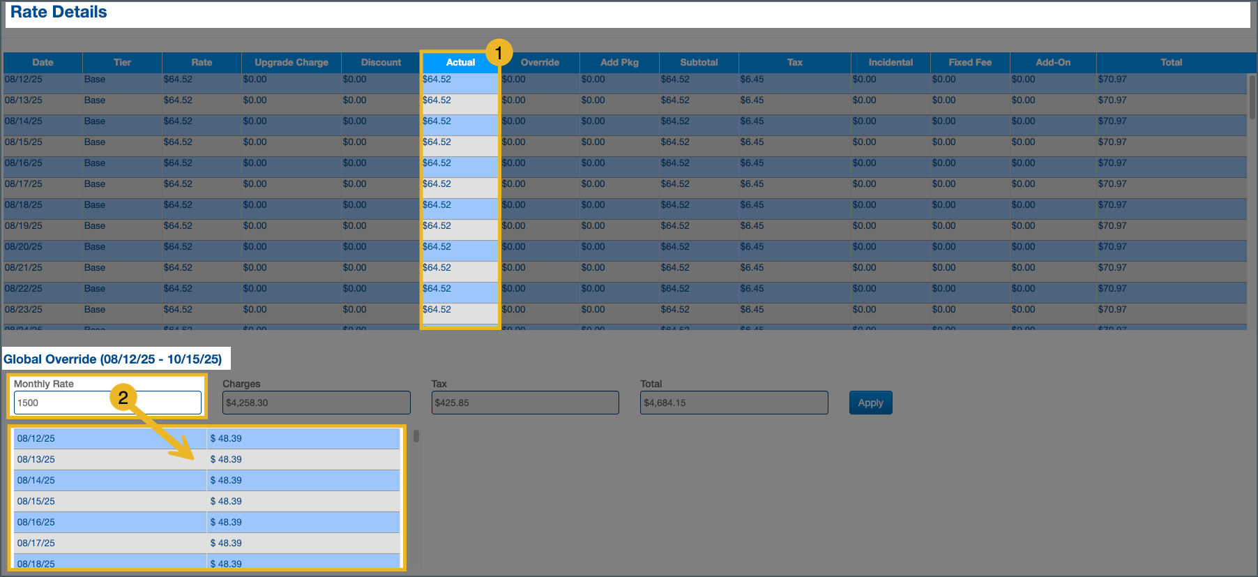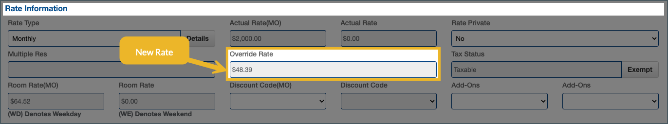5. Verify the Override: Return to the reservation screen—the recalculated daily rate will now appear in the Override Rate field.