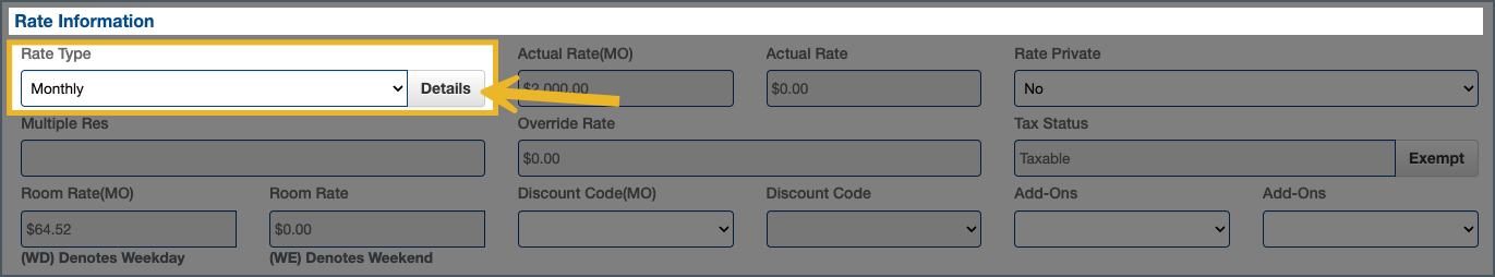 1. Access Rate Details: Navigate to the Rate Information section and click Details to view the current rate breakdown influenced by your existing weekly/monthly setup.