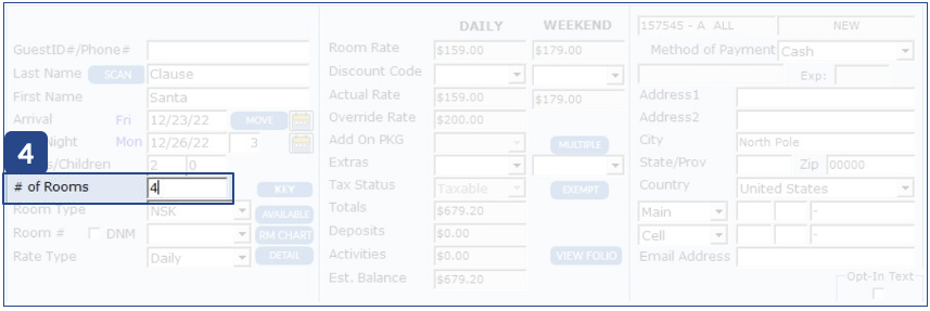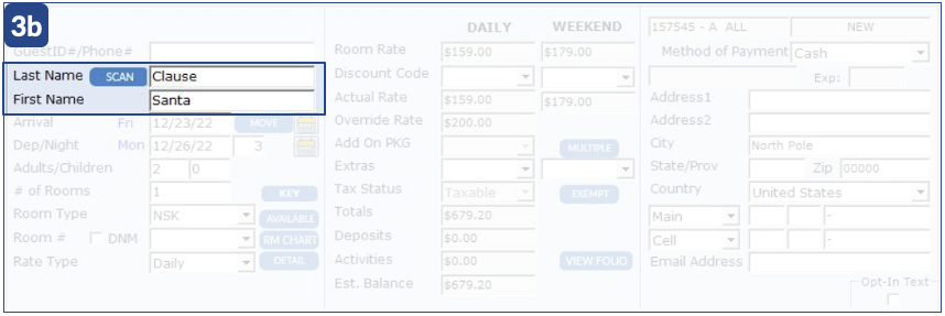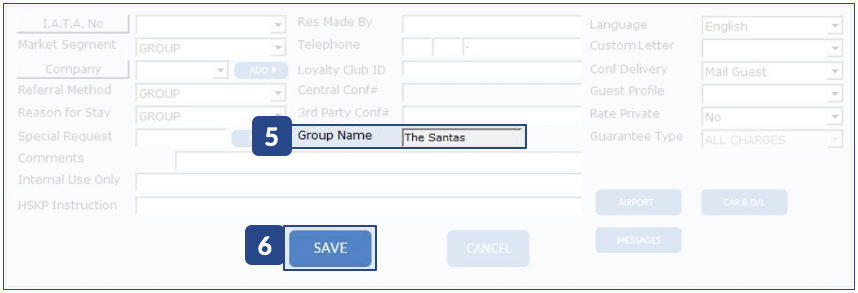 3b- If the Group Guarantee Type is "Rm&Tax" or "All Charges" (one person will pay the bill from the group master), the last and first name fields will be auto-filled by the group contact name. The name can always be changed before saving.