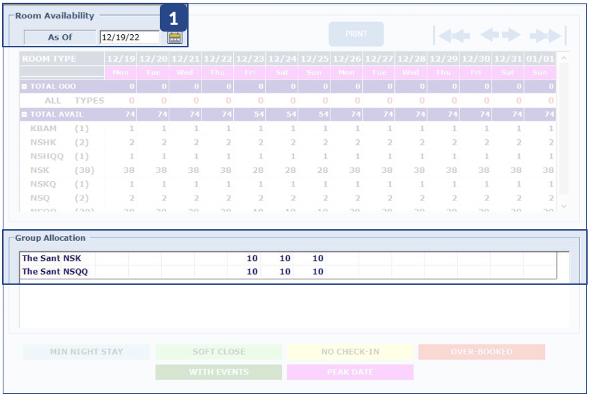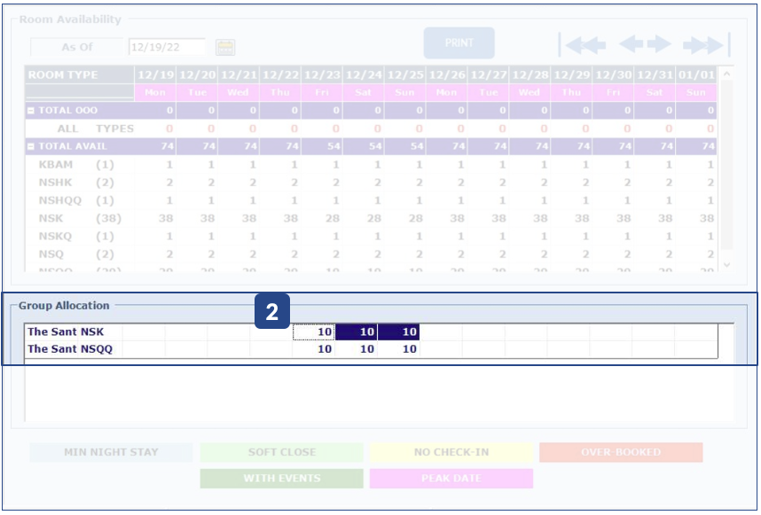 2. Click on the allocation field matching the arrival date and room type you want to pick up. Drag to pick up as many dates as required. Release the mouse to create the reservation.