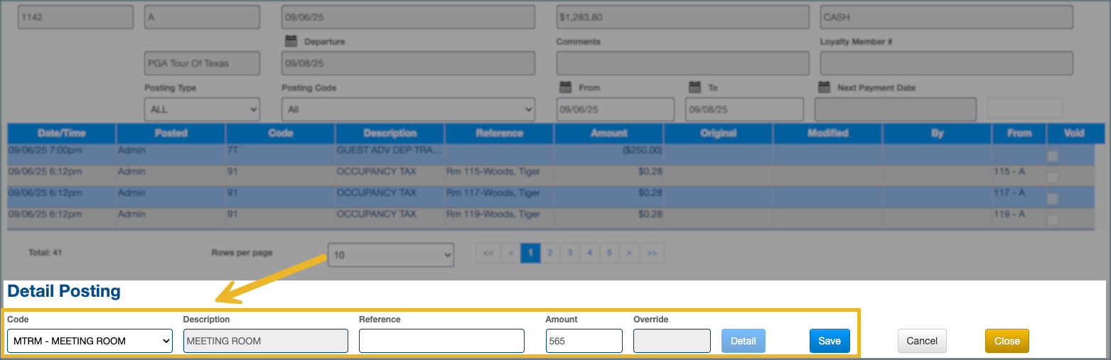 3. In the Detail Posting section at the bottom of the folio, select the correct transaction code for the charge or payment you intend to post.