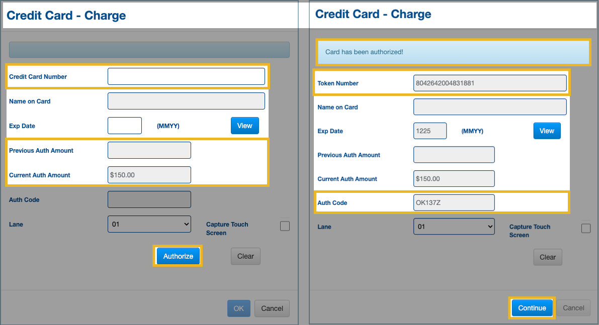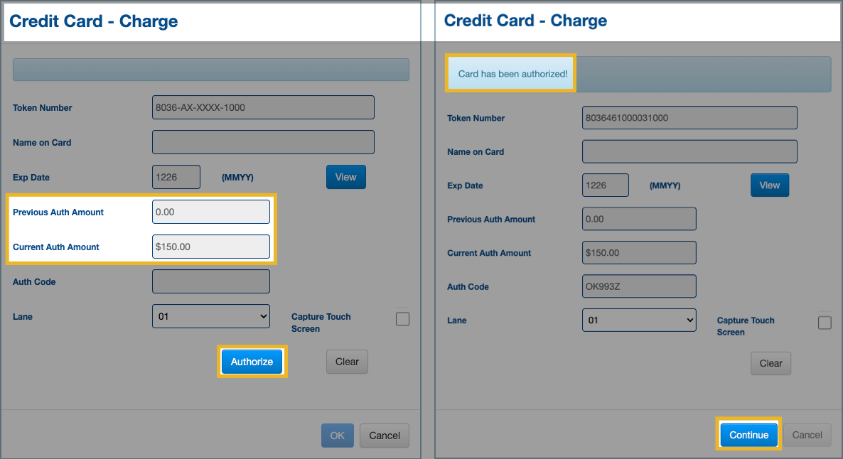 - When the Credit Card – Charge window appeared, did I confirm whether an authorization was already pending, or if I needed to create a new one?