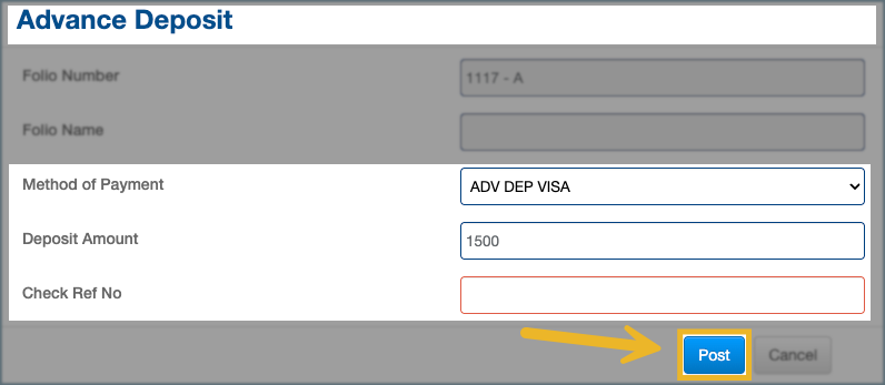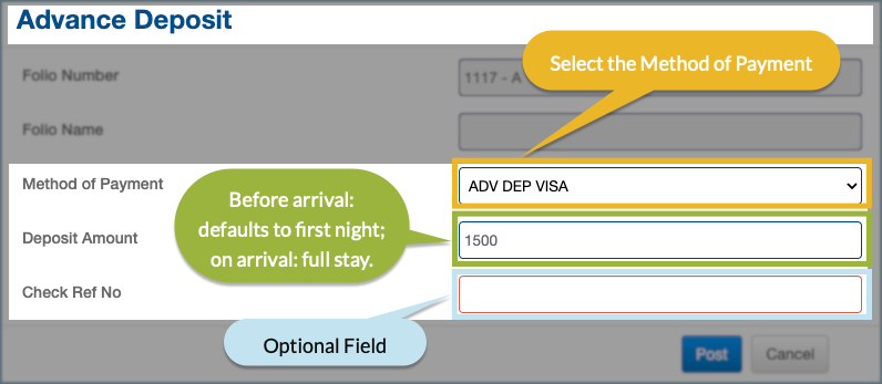 ? Watch Video Advance deposits play a key role in hotel operations by securing reservations, ensuring payment commitment, and maintaining accurate financial records. In Visual Matrix Cloud, you can post an advance deposit directly from the ...