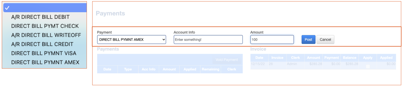 - A/R Direct Bill Debit: this will post a debit to the balance. It can be used to balance a pending credit.