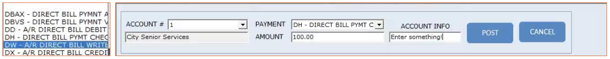 - A/R Direct Bill Debit: this will post a debit to the balance. It can be used to balance a pending credit.