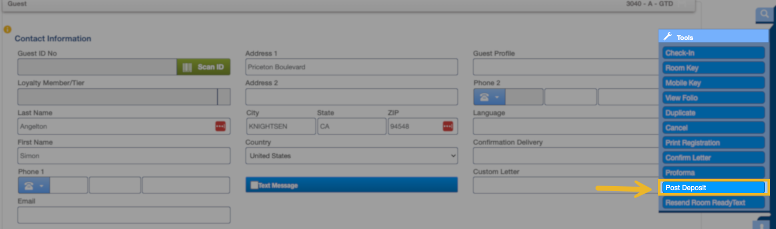 1. In the open reservation, locate the Toolbox panel on the right and click Post Deposit.