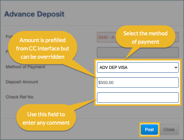 The deposit amount is prefilled by the system. If posted before arrival, it follows your credit card interface setup (first night or full stay). If posted on the day of arrival, it defaults to the full stay amount. You can override this amount if needed.