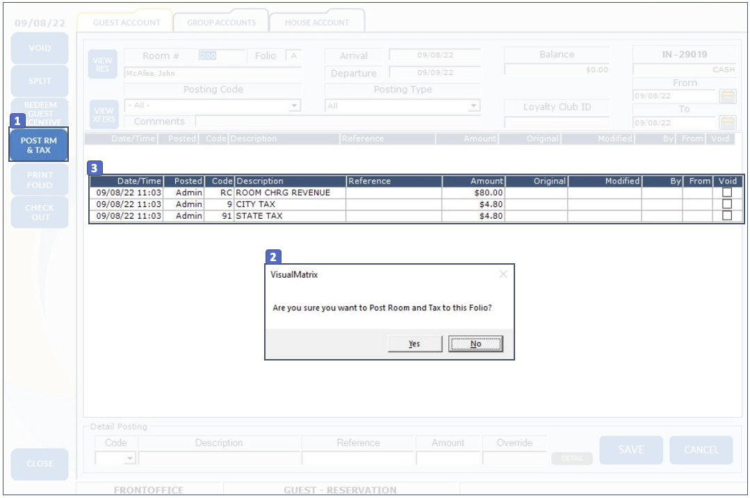 3. After you select Yes the night's charge will post at the room charge and any associated tax based on the reservation information. If the reservation is tax-exempt, tax will not post.
