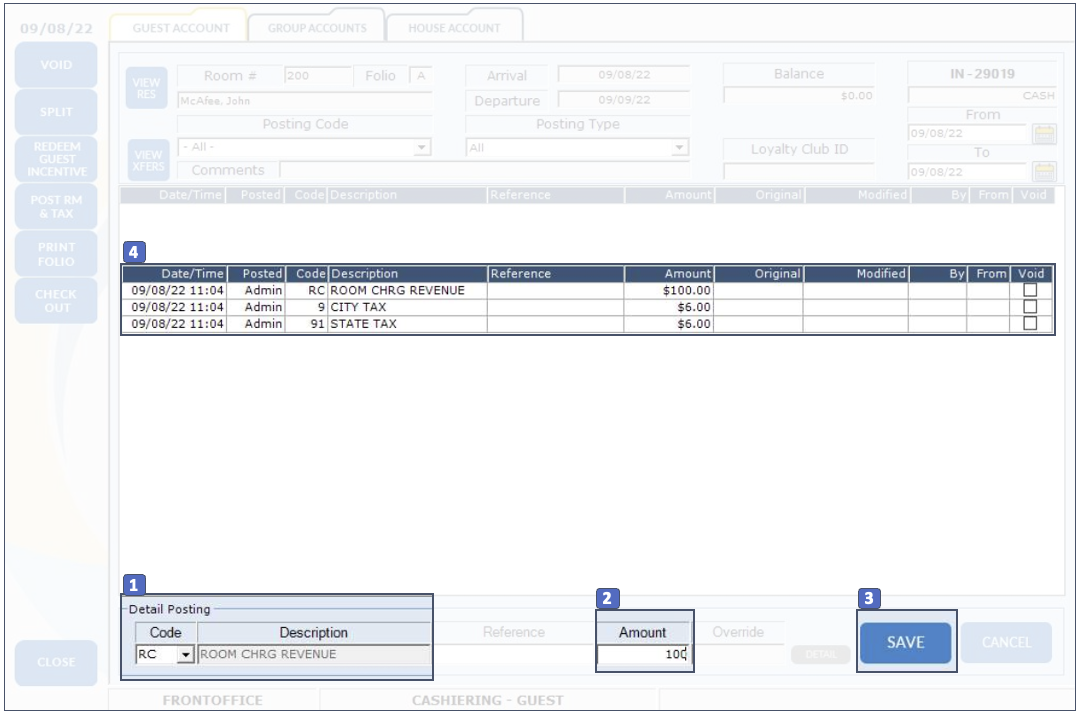 ? Watch Video Path: Front Office > Cashiering > Guest Account 1. Click In House Guest on the left. 2. Click on the room folio. 3. Click View to open the folio. 4. Choose the transaction you want to post from the Detail Posting dropdown at the bottom ...