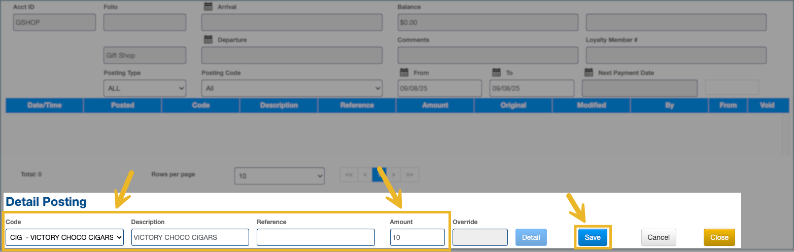 3. In the Detail Posting section at the bottom of the folio, choose the Charge Code to post.