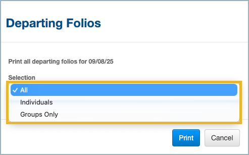 - All: Prints all folios scheduled for check-out today, including both individual guests and group members.