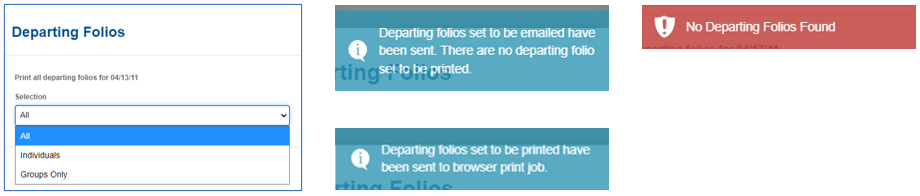 - No Departing Folios Found: There are no scheduled departures for the selected date, or all departing reservations are configured for email delivery only.