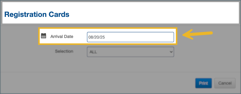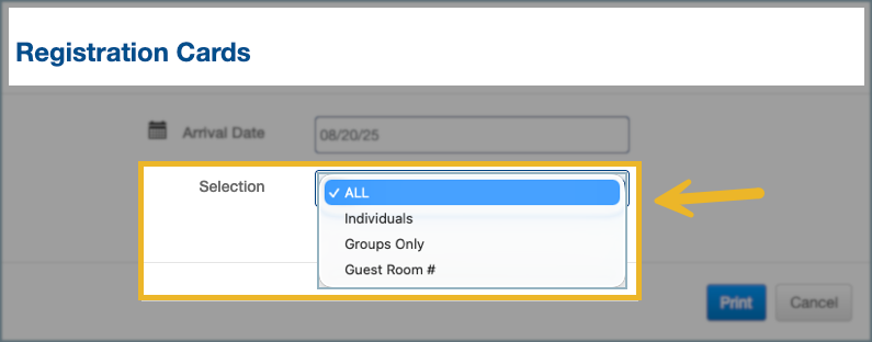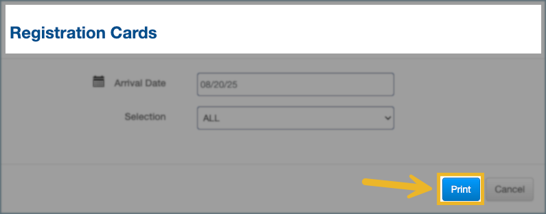 Make sure your printer is set up properly and the registration card template is configured via property settings. Then follow the steps below to preprint for individual guests, groups, or all arrivals.