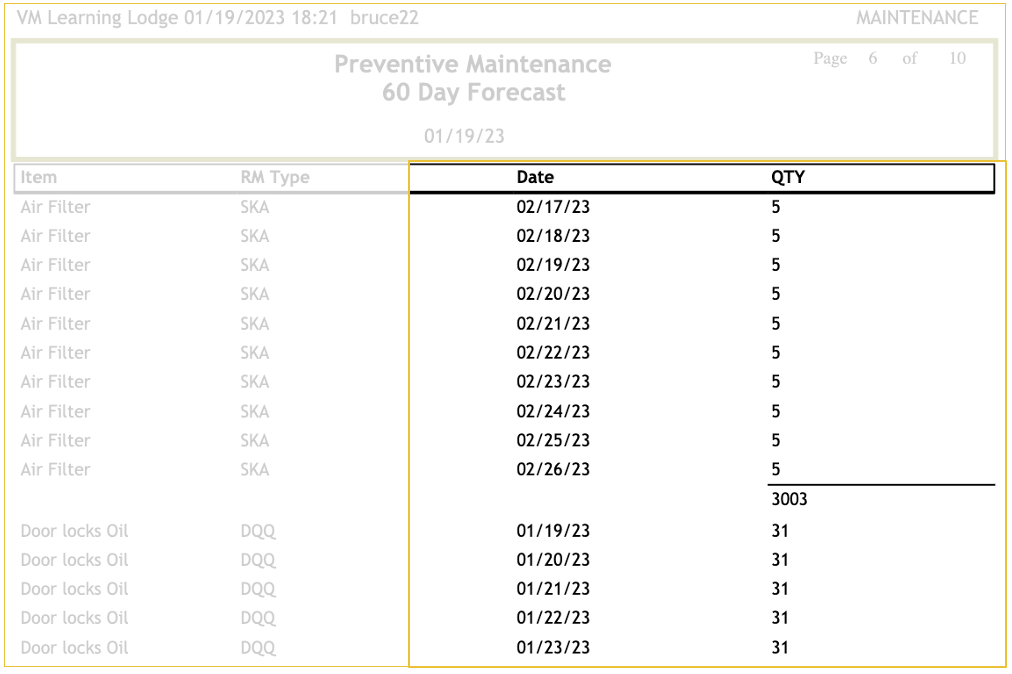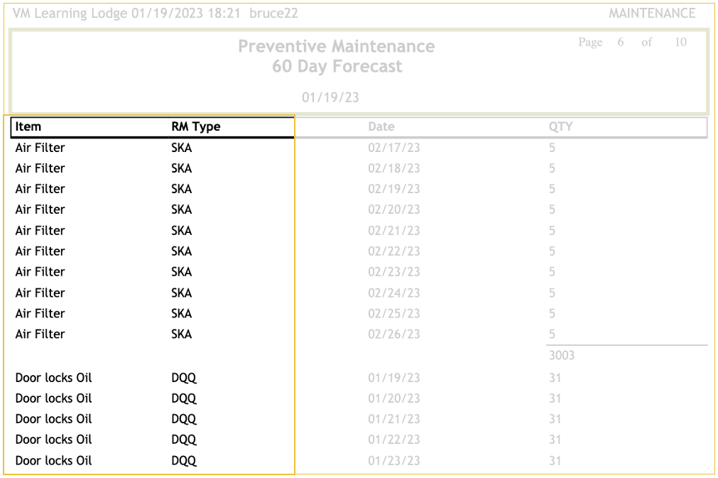 - In between, total of item that will have maintenance for that room type or common area for the next 60 days.