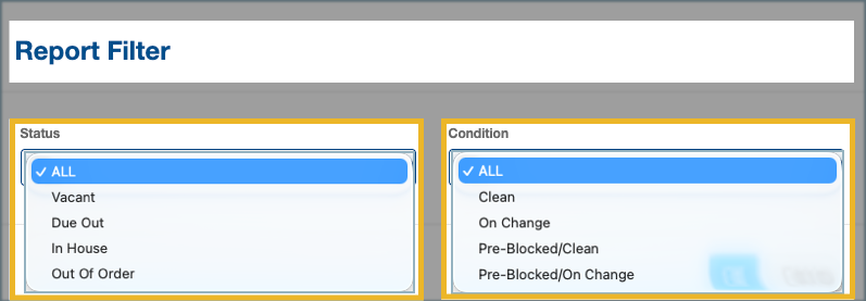 You can choose one value from both filters to narrow the list—for example, print only rooms that are In-House and Clean.