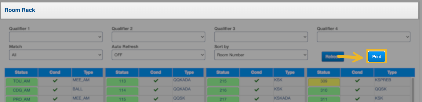 1. Click the Print button in the Room Rack section (upper right area of the screen).