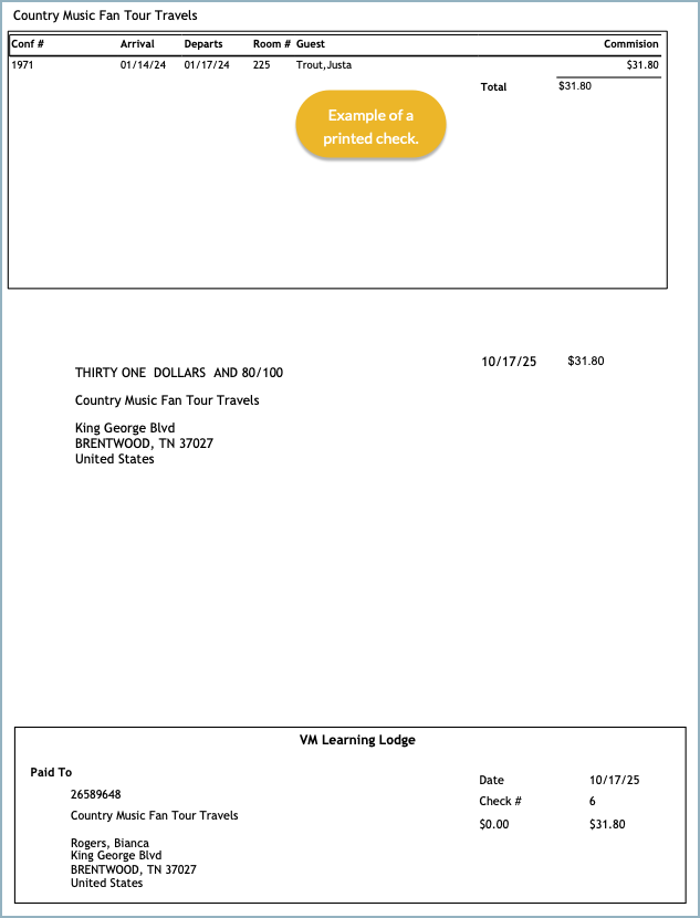 On the left side, example of a Travel Agent commission printed in Check format. This document shows the total commission amount and reservation details included in the payment.