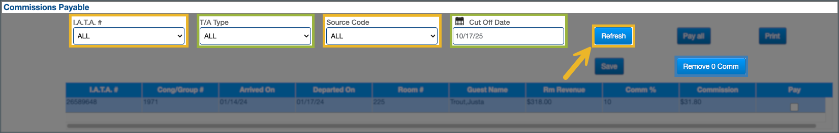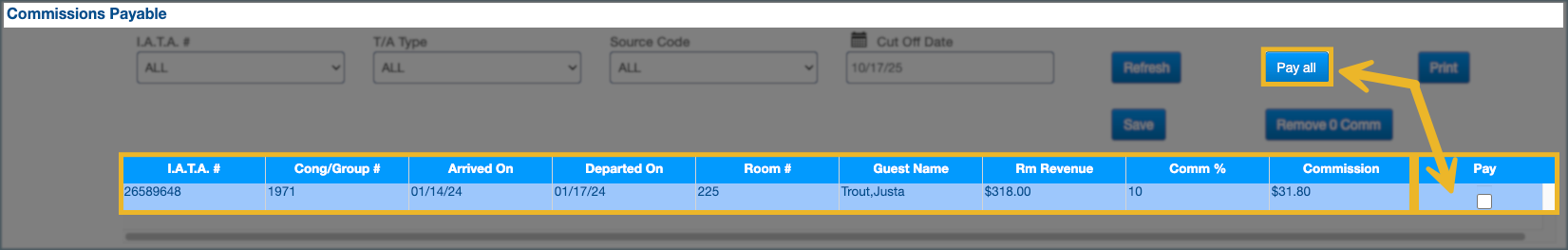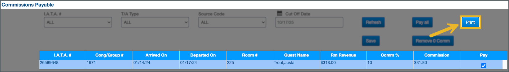 The Commissions Payable screen displays all reservations linked to Travel Agents. The grid includes the calculated commission amount for each reservation, even if the commission is $0. Use the filters at the top of the screen to narrow the list by Travel Agent, Travel Agent type, Source Code, or Cut Off Date.
